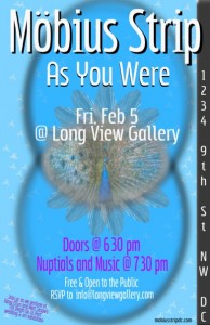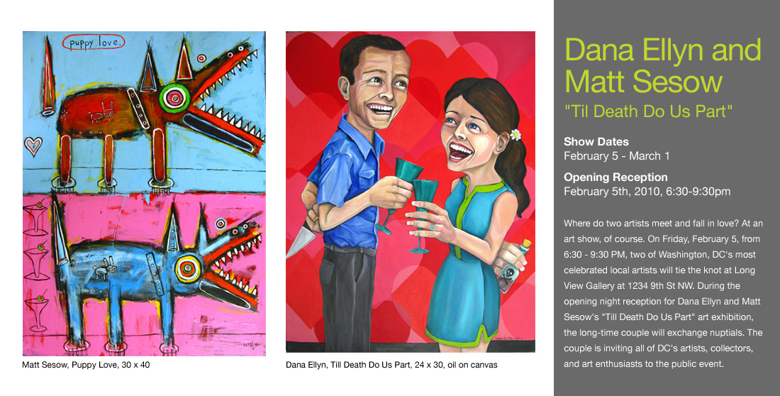 Local artists, Dana Ellyn (a PQ resident) and Matt Sesow (Adams Morgan), will be tying the knot this Friday evening at Long View Gallery @ 1234 9th St NW! This wedding and art exhibition is free and open to the public. Doors open at 6:30pm and nuptials begin at 7:30pm followed by live music. One needs only to RSVP with your name to info (at) longviewgallery.com. No gifts please, but be sure to pick up a painting if one strikes your fancy. Also of note: a member of one of the bands performing at the event, Möbius Strip, lives in the Penn Quarter.