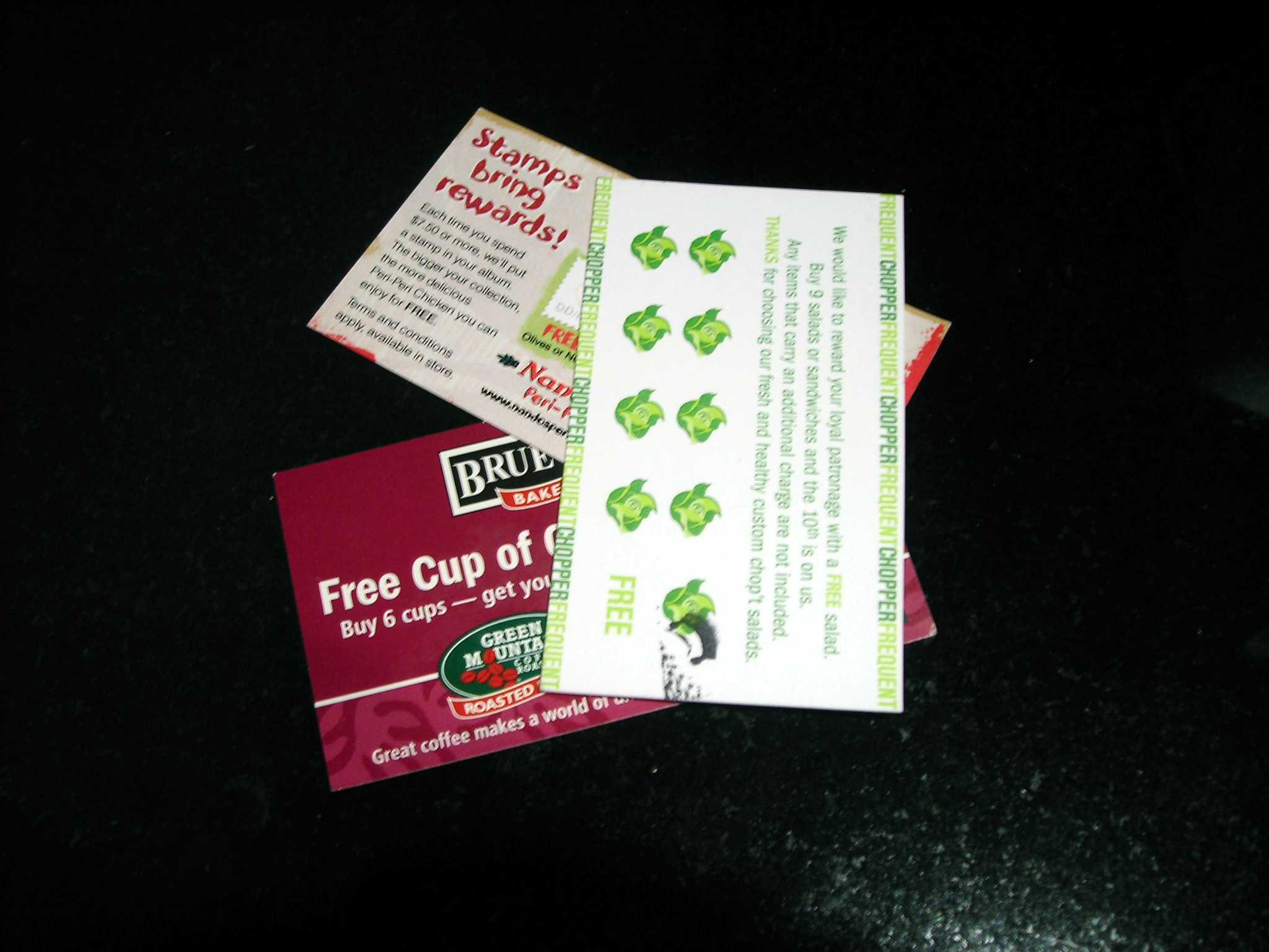 Of these the only one I use on a regular basis is the Brugger’s coffee card. I probably only get coffee out once or twice a week, but it doesn’t take long (when you’re buying two cups at a time) to get to that free cup.