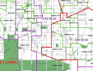 We’ll start this series off easy. Here’s the rundown: The Disctrict has Wards. Every Ward is made up of several ANCs (Advisory Neighborhood Commissions). Every ANC is made up of SMD (Single Member Districts). These lines are redrawn every 10 years around the time of the national census. They will be redrawn next in 2010.