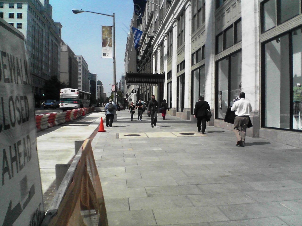 It was a long miserable Winter if your commute had you going near the Woodies Building, but relief is in sight. Recently construction fences were removed from the 11st street side of Woodies (between F & G), although there are still barriers in the road reducing the number of lanes open to auto traffic.