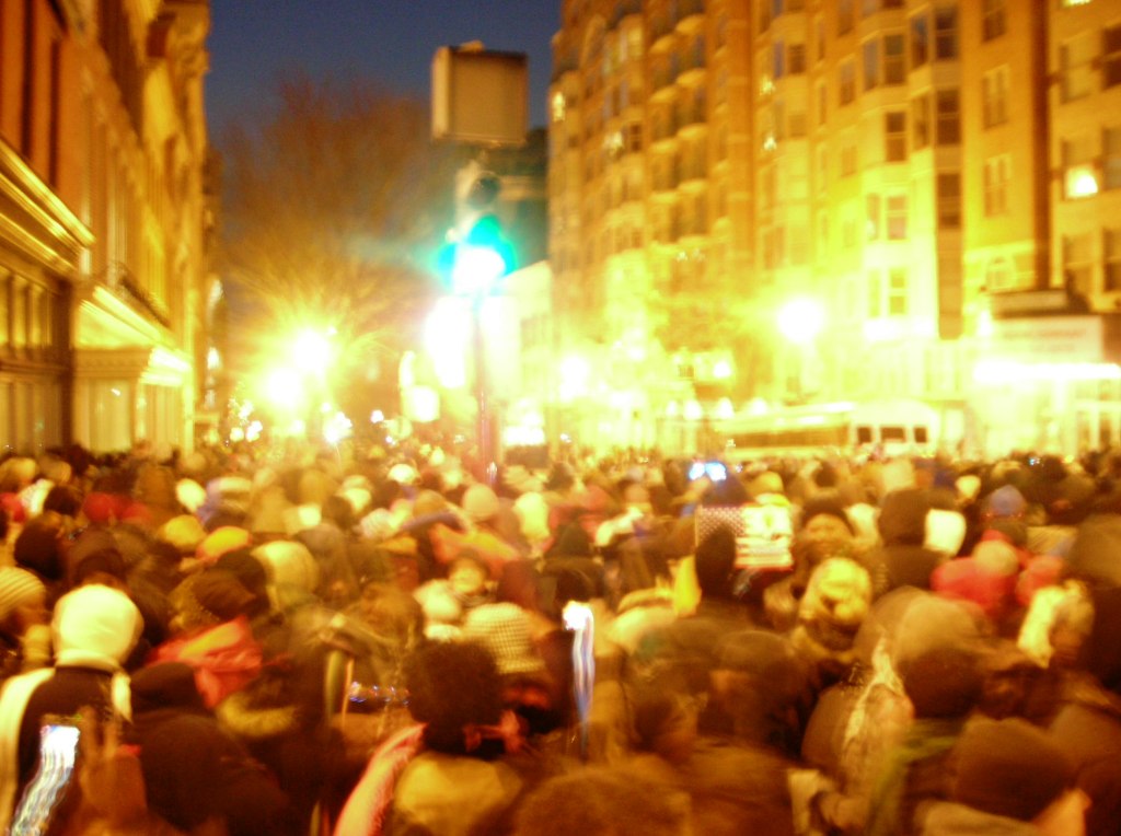 6:50 am – Breaking out into occasional chants of “O-B-A-M-A” and “open the gate”, with 10 minutes to go to 7 am, 7th Street NW is fully packed past E Street NW with people streaming in from the Gallery Place Metro. Those waiting in the crowd have all been amazed at the number of people in line. Check after the break for the street level photos.