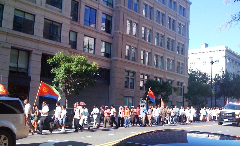 Erirea, in NE Africa on the Red Sea, had been a part of Ethiopia since WWII, and won its independence in 1991. Unfortunately, the regime that took control became drunk with power and in order to stay in control has abused the people, the country and some neighbors horribly. Unbelievable cruelty, torture and rapacity has taken over. In addition to the population, the security of the area has been jeopardized through arms and training provided to quazi-religious/political radicals in Somalia, and this month Congressman Ed Royce (R-CA) has pushed to have Eritrea placed on the US short list of States Sponsors of Terrorism. Congressman Chris Smith (R-NJ) has crusaded against gross abuse of religious freedom in Eritrea. There is no free media in Eritrea, people attempting to flee the country are shot on sight, and family members of escapees are subject to heavy fines and imprisonment. Literally hundreds of thousands of refugees are scattered around the world, with large camps set up in The Sudan and Ethiopia. The top abuser of human and religious rights and decency is the “president” of Eritrea, Isayas “Mad Dog” Afewerki. The chanting in the march was about “Down with Dictator”, Isayasyas must Go!”, etc. — I expect that reference to Bush was not widespread.