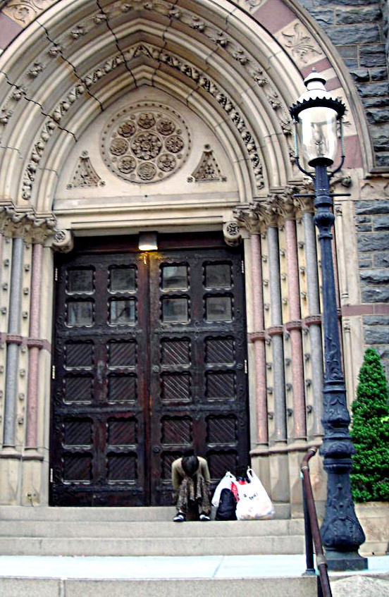 Gazing to my left during an afternoon walk around the PQ, I froze. An image seared by countless impressions acquired growing up in Mexico City’s then 14 million inhabitant metro urban madness snapped into focus. I paused and thought for a second. Then it hit me. The visual testimony was startling because it didn’t show up in a travel magazine or a National Geographic lecture. It materialized in my field of view in downtown DC on the steps of 10th Street’s St. Patrick’s Church. I found Ms. Silent Prayer (right) sitting in a bowed figure on the steps of St. Patrick’s with bags by her side much like I used to see in a city’s zocalo (town plaza). Is she praying? Is she sleeping? Is she in despair? I don’t know. I didn’t stop to ask her. Disturbing one’s quiet time and holy space is rude. No one truly knows the plight of another by witnessing the exterior rendering anyway. Despair drapes itself midday in Zegna suits and BCBG dresses too. My hope? This image is a seduction strafing my thoughts with third world notions and the reality is that this woman has a safe, comfortable place she’ll return to at night called home.