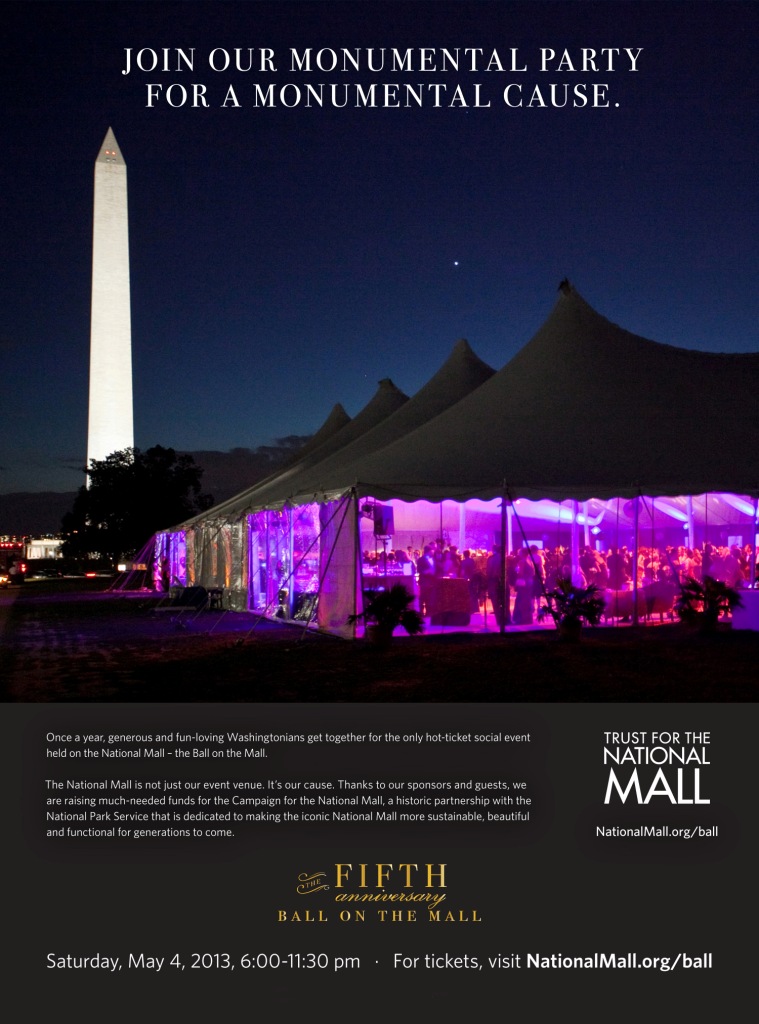 Ball on the Mall, the black tie event held each year on the National Mall and hosted by the Trust for the National Mall, is being held on Saturday, May 4th. The official invitation notes two levels of individual tickets; Standard Ball tickets are $175 and good for entry at 8 pm, VIP tickets run $350 and let you in at 6 pm for cocktails, dinner, and then of course the 8 pm ball.