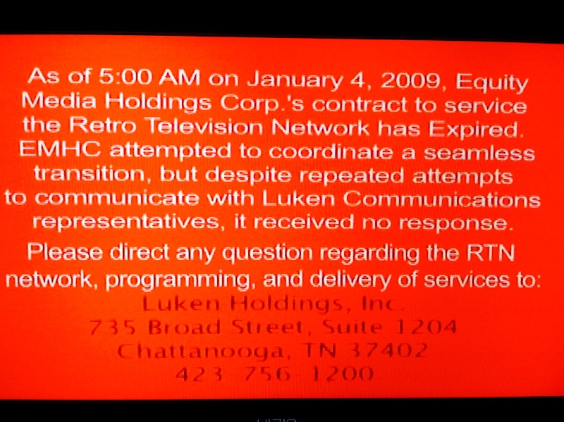 Well on Sunday morning we were greeted to an ominous message on our TV screen when tuning to 7-3, the digital channel for RTN. A quick web search turned up DCRTV notice that RTN had “apparently gone belly-up due to obvious cash flow problems resulting from sluggish ad sales.”