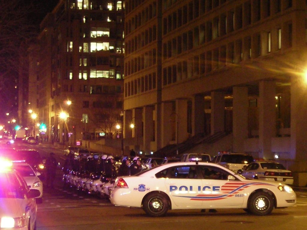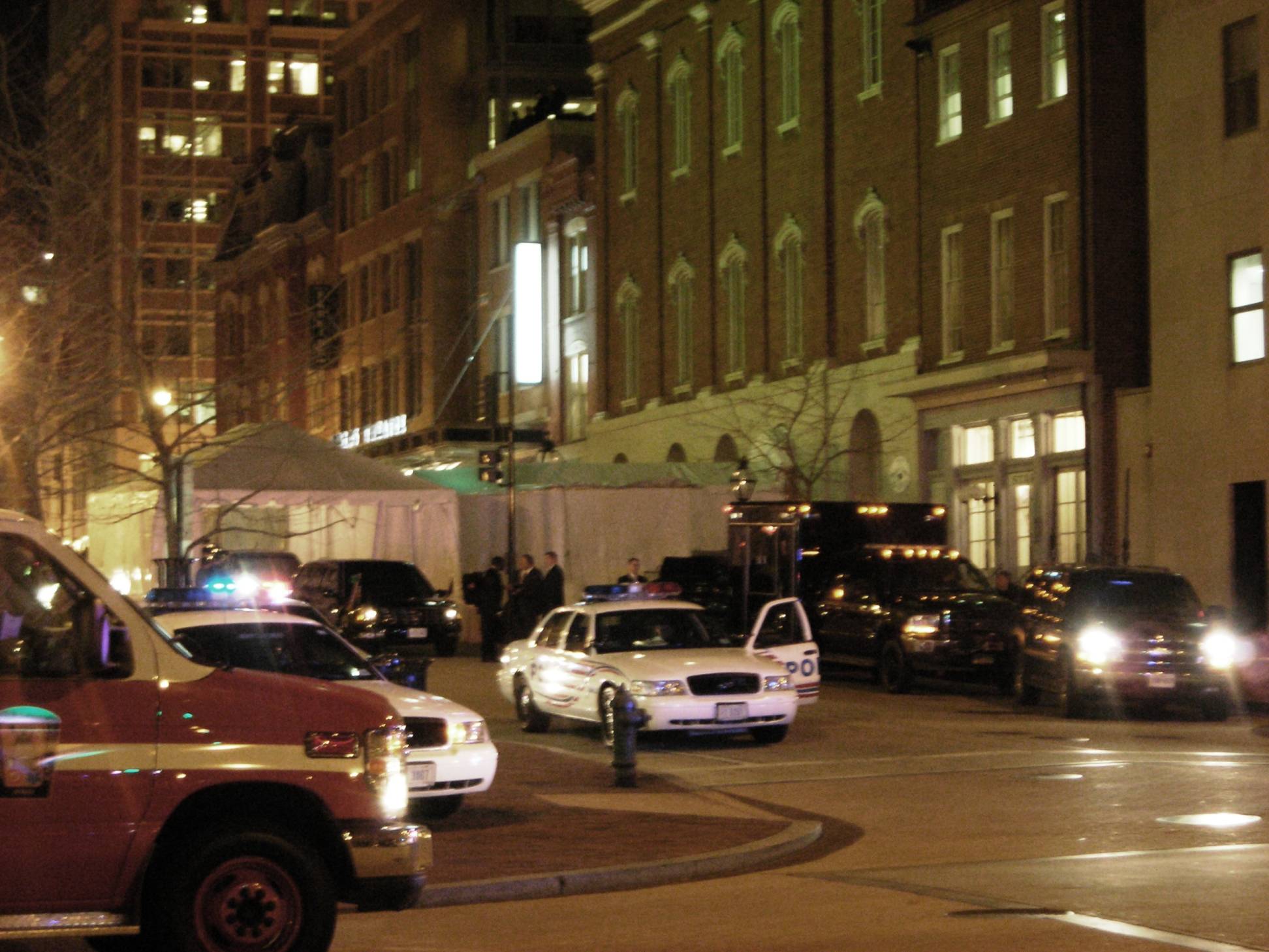 Our trusty readers, eyes and ears on the street, tipped us off that President Obama was to put in an appearance at Ford’s Theatre tonight for their grand reopening celebration. We aren’t TMZ but our regular evening stroll yielded the photo above (click on it to get a closer look) where you can see the port-a-canopy surrounding the Presidential limousine. Small crowds of people clustered on three of the four corners at the intersection of 10th and E Streets NW cameras at the ready. Police were on the fourth corner, the one on the same side of the street as Ford’s, to keep an eye on everything. We also caught the Obama mototeam camped out on E Street NW in the photo after the break while they awaited word that it was time to leave.
