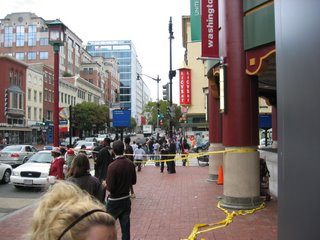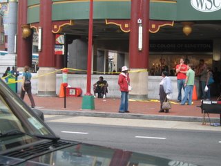 The “bucket drummer” that usually hangs out at the 7th and H St metro entrance caught police attention this afternoon. Few people love him, and most people hate him because of the excessive volume and the tendency to play after midnight. Today, it seems that his antisocial behavior has caught up to him. He apparently got cut in the hand by an irate pedestrian.