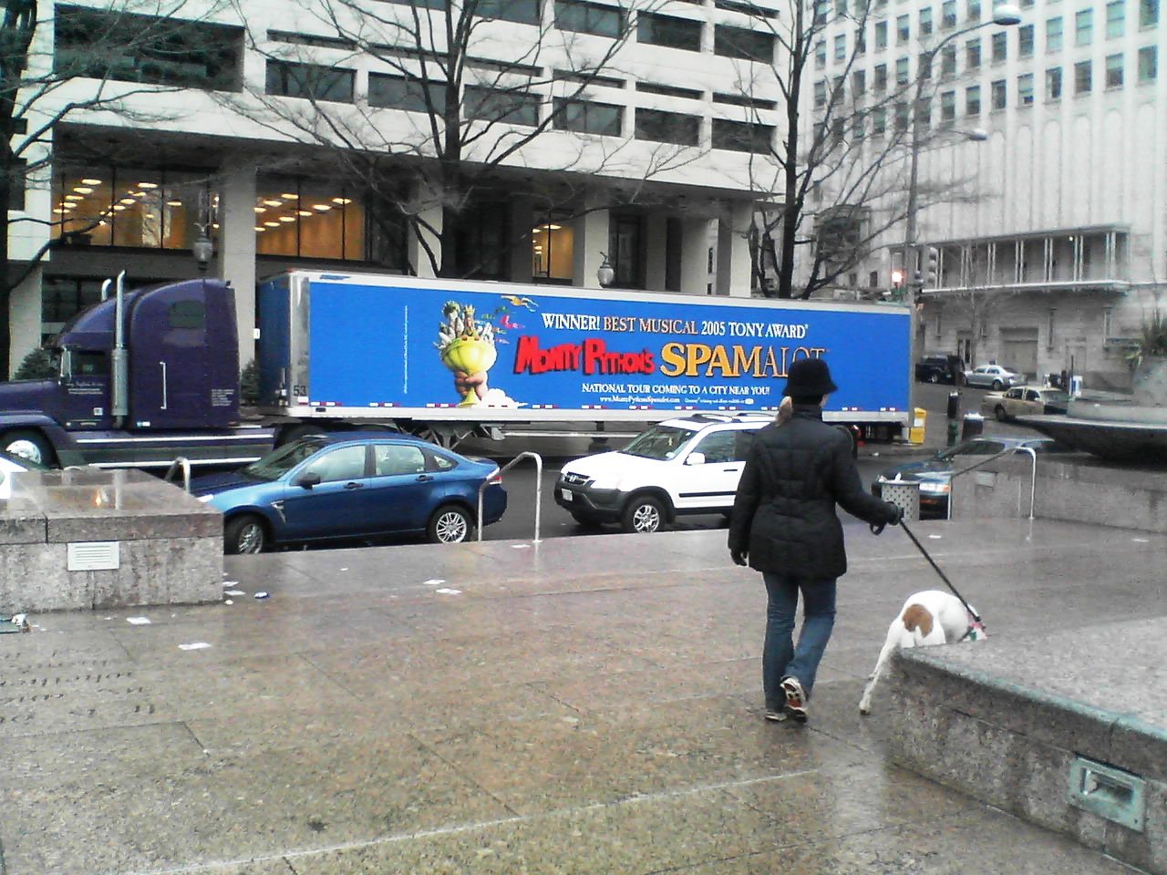 We caught the moving trucks for SPAMalot outside of the National Theatre this morning. Up next, SCRAPPLEalot? (Groan)