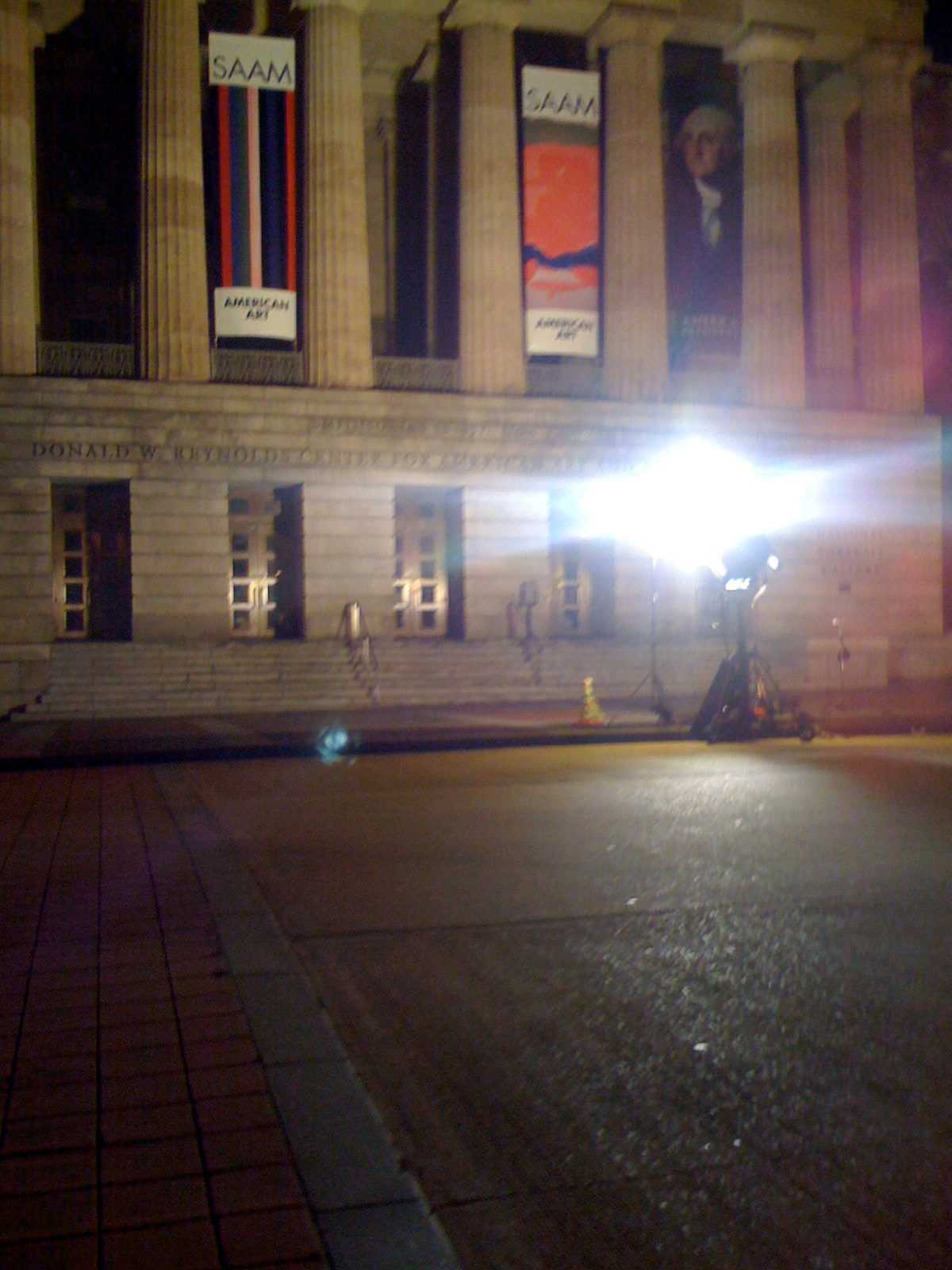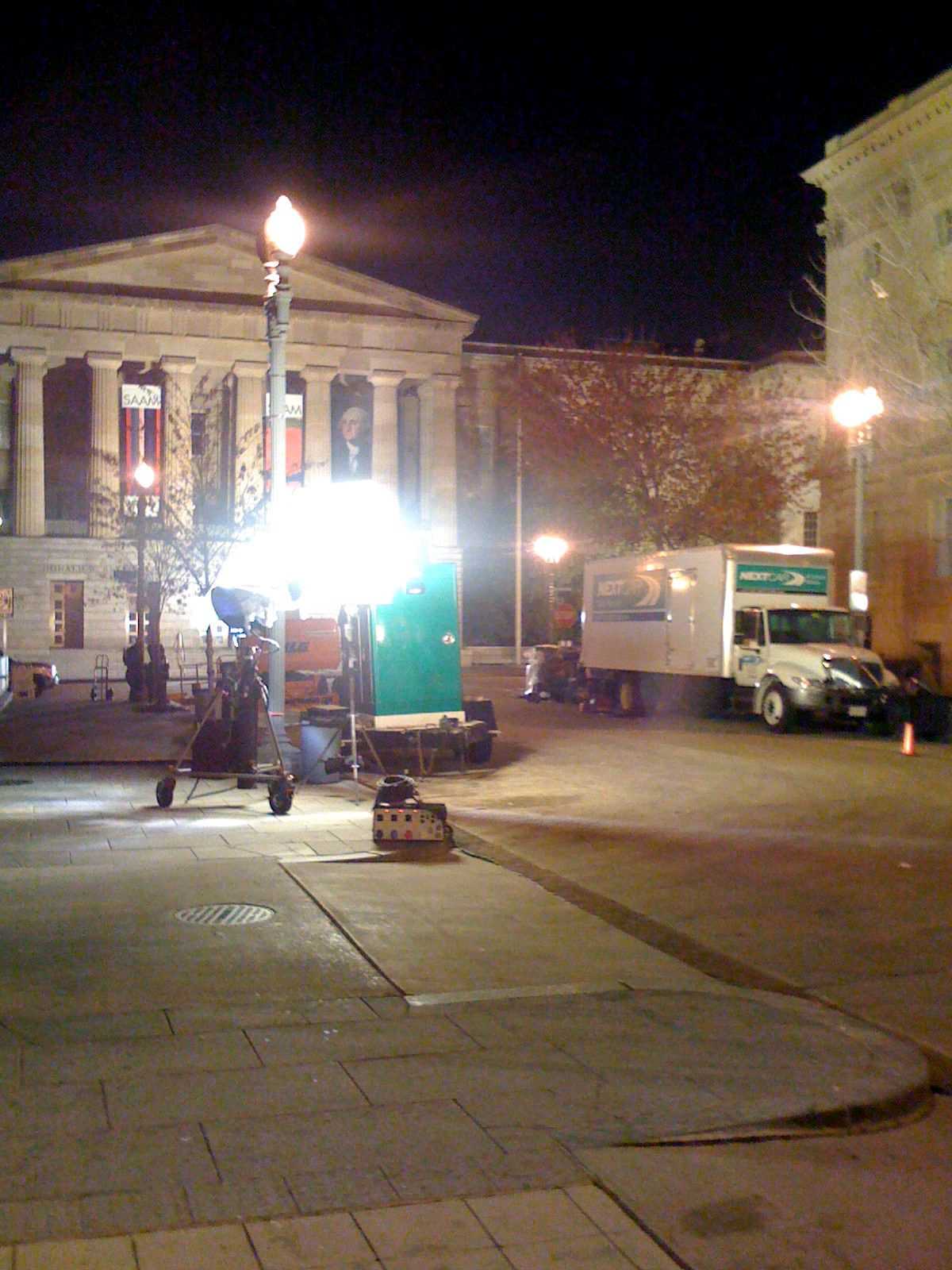 They were filming the movie over at 18th St & L St. When we were walking back from dinner one Friday night, we got talking to the grips and they let us stand around and watch. Got to see Russell Crowe and Rachael McAdams acting out a scene in front of the Washington Globe Building.