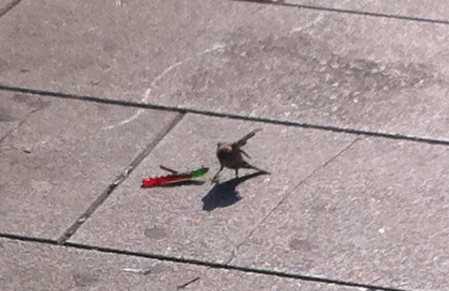 Maybe this doesn’t qualify as the photo of the week, but it was too good to pass up.  This morning we caught the above bird (is that a sparrow?  albatross?) on F Street trying to drag home a morning snack.  We don’t know if he eventually got it off the ground, but he managed to drag it across the sidewalk during the minute or so we were there.