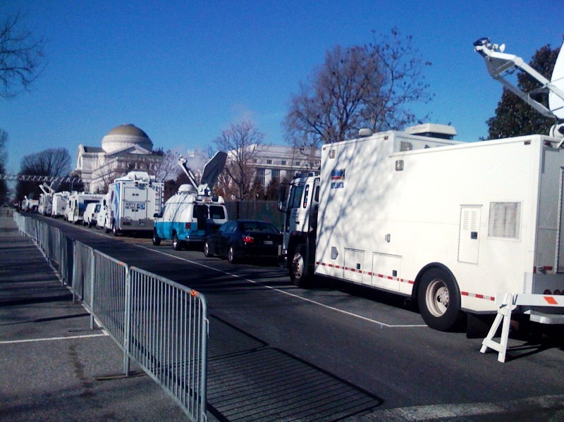 From 10th & F we walked down to the Mall to check out the media trucks now lining our streets. TV trucks from all over the United States are readying themselves for their inauguration day broadcasts. MSNBC has been broadcasting live from a mobile studio on the Mall around 7th Street.