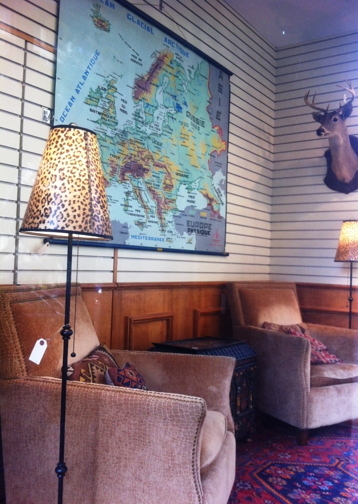 Weschler’s (909 E St NW) has turned over their window display to a local designer and we love the look.  We assume this is a continuation of their annual “Designer’s Best Bids” series, where each week a designer creates a display made up of goods to be auctioned off.  We don’t make it to many of these weekly Metro auctions, but that map has us thinking maybe we’ll place an absentee bid and see what happens.