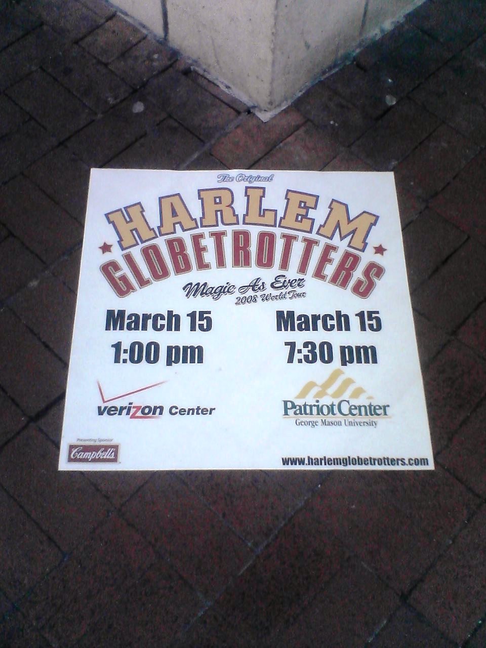 If you ever look where you’re walking, you probably already know this: On the Ides of March the Harlem Globetrotters will be at the Verizon Center for two shows (games?), and the ads are plastered all over the streets. Not the same without Curley Neal playing, still I bet they put on a fun show. And who knows, maybe they’ll play those evil robots from the Gilligan’s Island TVmovie! — (Ed. Note: it was a toss up between this reference and the time they were on Scooby Doo).