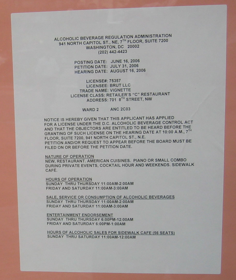 Next, Maisha told us about a liquor license posting on another window of the same building (called the Portrait building). This restaurant (701 8th St NW) will be called Vignette and it appears to be a piano bar, with American cuisine, and includes a sidewalk cafe (56 seats) directly across the street from the Smithsonian museum – great location!