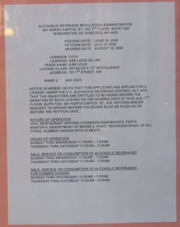 As GPLiving was walking around the Gallery Place complex this weekend, we noticed yet another liquor license application. This one is on the East-side door of the G Street alley that leads to/from 6th street (not as frequently traveled as the 7th street side). It looks like a bar, called Bar Louie (701 7th St NW), that will be opening somewhere in the Gallery Place complex. We think it will be on the first floor closest to the door where the liquor license is posted. We guess that Bar Louie is part of this chain. We’re curious about the proposed Summer Garden, which is supposed to feature 80 seats, because there isn’t any space for an outdoor garden in the near vicinity!